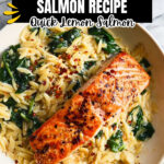 A delightful one skillet salmon recipe featuring perfectly seared salmon fillets served over creamy lemon orzo with baby spinach and Parmesan, making for a quick and flavorful dinner.