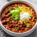 - Serve with toppings: Ladle the chili into bowls and serve hot. Add your choice of shredded cheddar cheese, sliced green onions, chopped red onions, sliced jalapeno peppers, or sour cream as toppings.