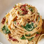A creamy and flavorful linguine pasta dish with a vibrant sun-dried tomato and spinach cream sauce, finished with Parmesan cheese and fresh basil. Perfect for a comforting yet elegant vegetarian meal.