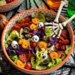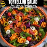 Since this salad has fresh greens and soft cheese shapes, I don’t recommend freezing the assembled salad. Some of the components, like cooked tortellini, can be frozen individually, but the cheese skulls won’t hold up. For best results, make it fresh for your celebration or freeze pasta separately for future use.