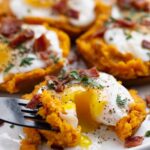This Breakfast Sweet Potato recipe features tender baked sweet potatoes filled with a savory mixture of crumbled bacon, butter, and shredded white cheddar cheese, topped with a perfectly baked egg and garnished with minced scallions. A hearty and delicious breakfast option that combines the natural sweetness of sweet potatoes with savory flavors and a satisfying texture.