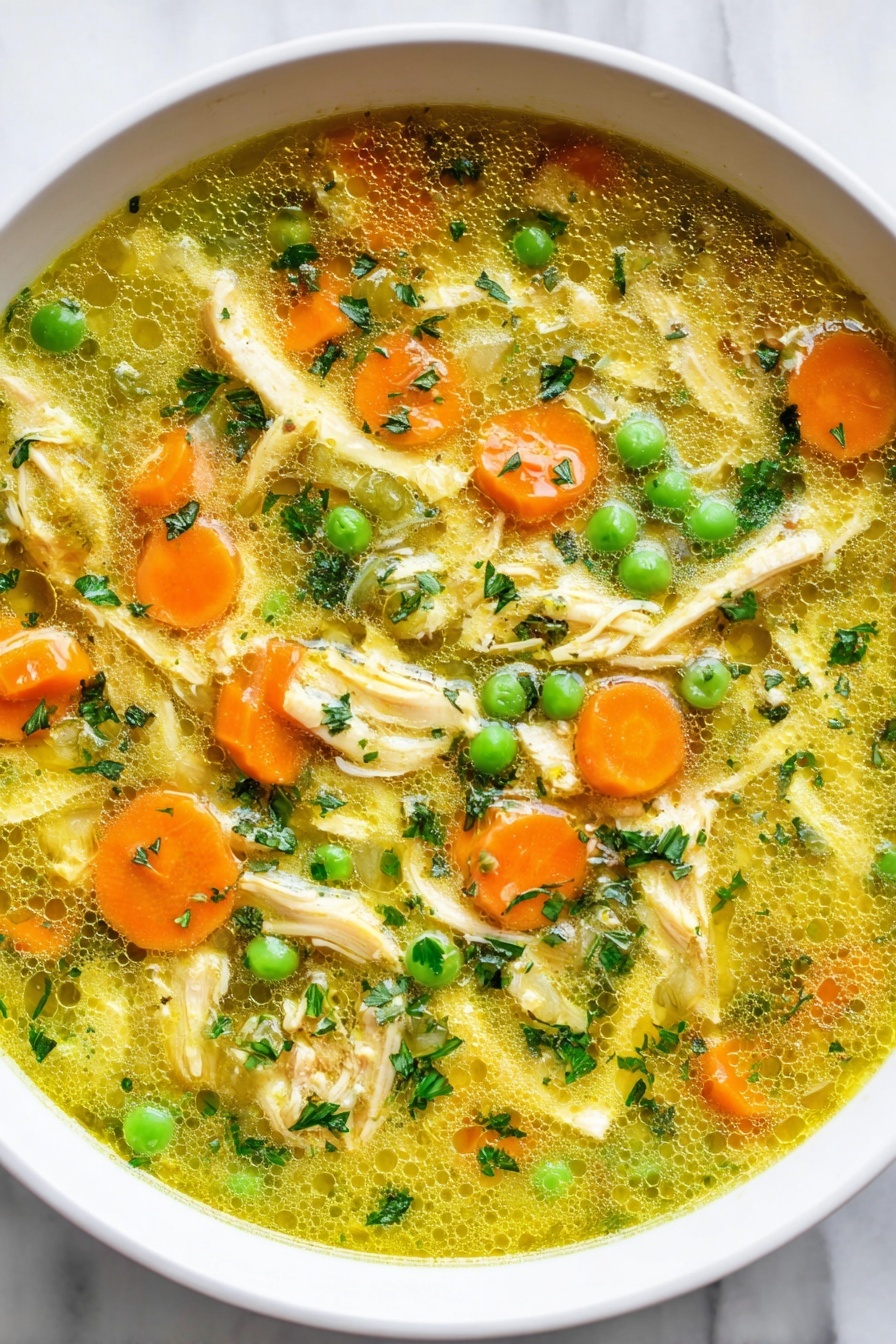 Carefully remove the chicken from the pot onto a cutting board and let it cool for a few minutes. Use two forks to shred the chicken or cut it into bite-sized pieces—whichever you prefer. Return the chicken to the soup and add the frozen peas and fresh parsley. Simmer gently for another 5 minutes so the peas soften and the flavors meld beautifully.