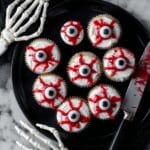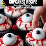 These spooky Eyeball Cupcakes are perfect for Halloween parties or any fun occasion. Moist chocolate cupcakes are topped with creamy vanilla buttercream frosting, large candy eyeballs, and a bloody jelly piping that mimics eerie blood vessels for a creepy yet delicious treat.