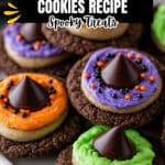 - Decorate: Add Halloween sprinkles onto the frosting around the Hershey’s Kiss for a festive look. Repeat for all cookies and let the frosting set before serving.