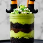 Create spooky and delightful Witches Brew Halloween Cake Jars featuring rich chocolate cake layers, vibrant green buttercream frosting, and whimsical fondant witch legs and shoes for a festive treat perfect for Halloween celebrations.